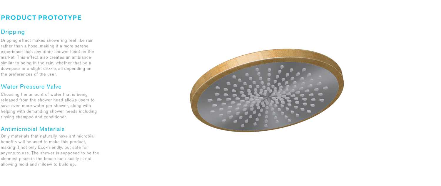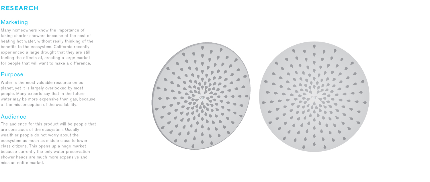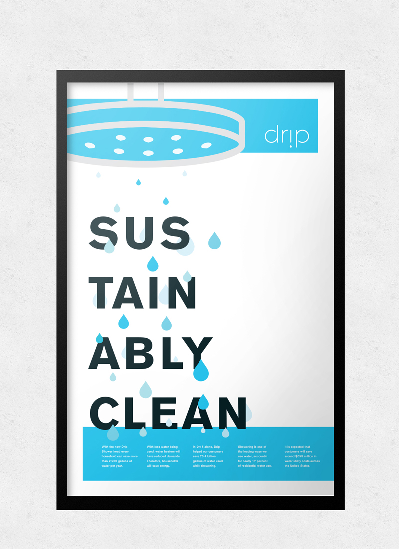 This is from an American Institute of Graphic Arts project that asked participants for a brand that would have the ability to help the environment. I created a shower head that would be able to drip water and save hundreds of gallons of water per household. Here are my designs of the product itself, along with the branding.