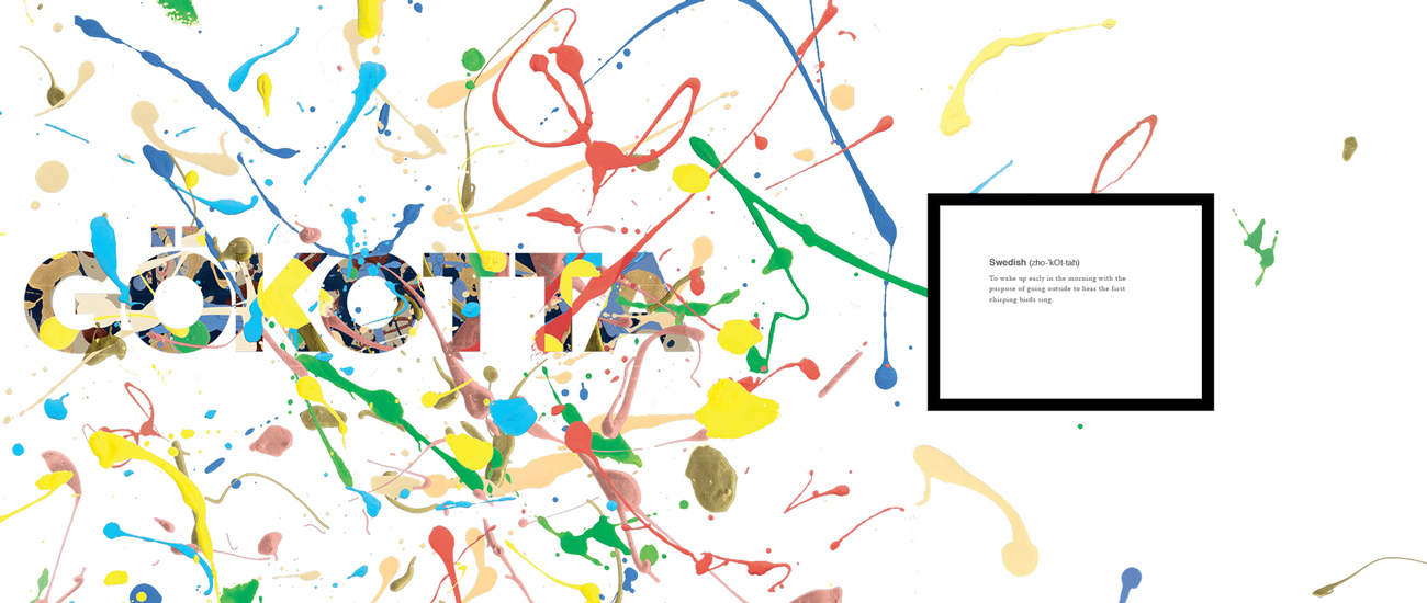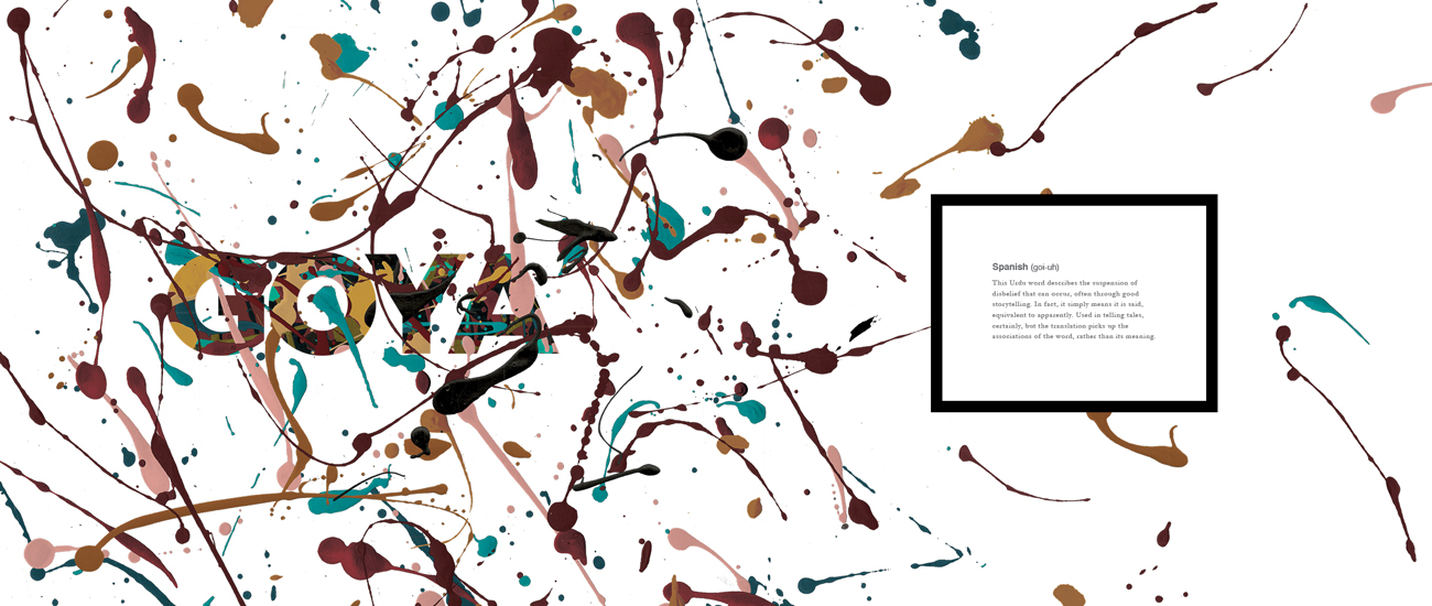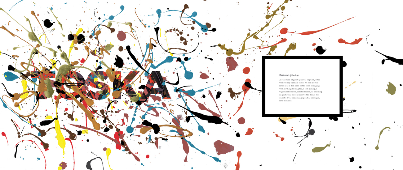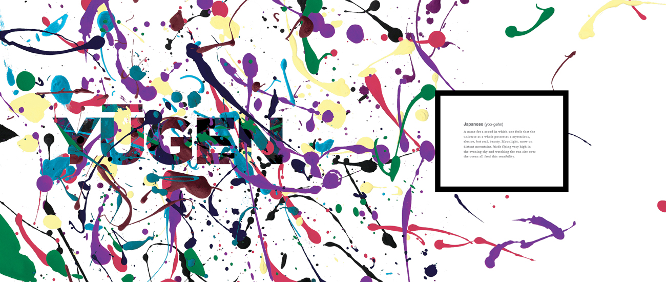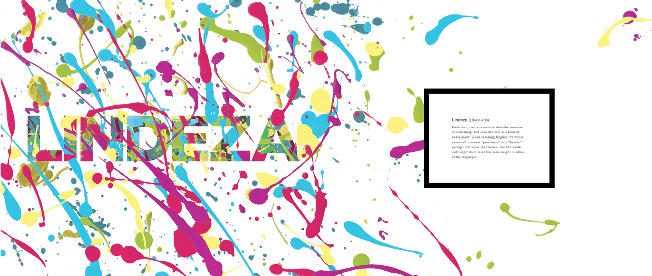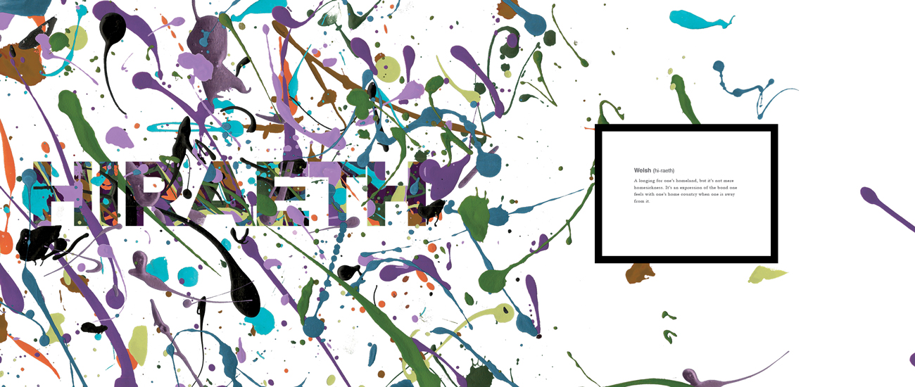 After researching the effects of language and how one's perception of the world can be altered simply by the language they speak, I created a book displaying the magnitude of expression that other languages have compared to English. The highlighted words are from a variety of languages, with none of their complex meanings having a direct translation into English.